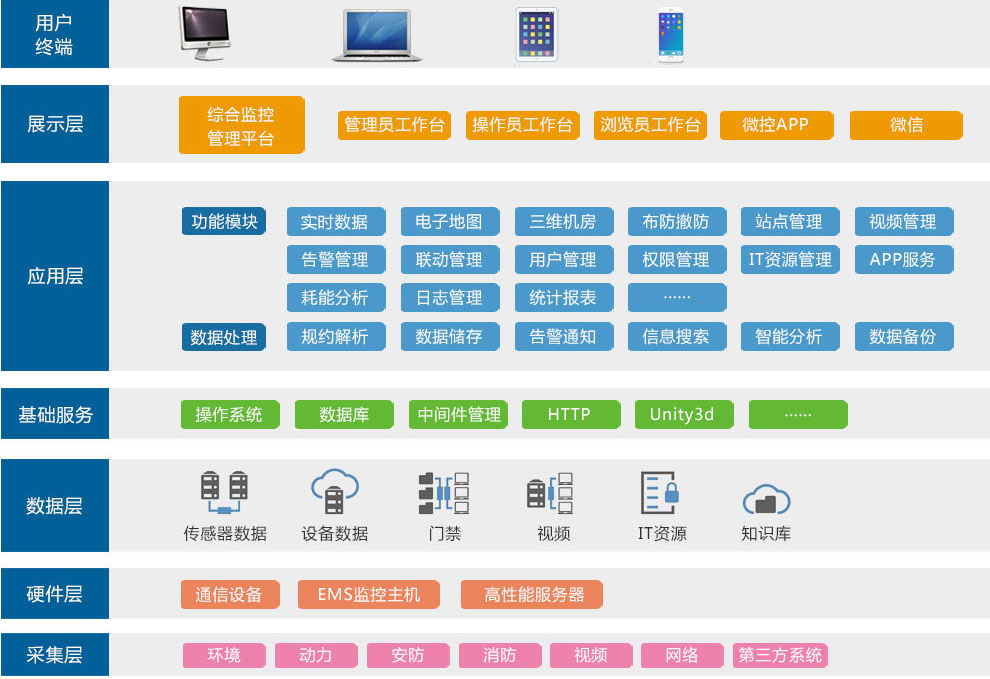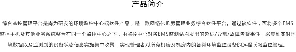 綜合監控管理平臺是尚為研發(fā)的環(huán)境監控中心端軟件產(chǎn)品,是一款網(wǎng)絡(luò )化機房管理業(yè)務(wù)綜合軟件平臺。通過(guò)該軟件,可將多個(gè)EMS監控主機及其他業(yè)務(wù)系統整合在同一個(gè)監控中心之下,由監控中心對各EMS監測站點(diǎn)發(fā)出的超標/異常/故障告警事件、采集到實(shí)時(shí)環(huán)境數據以及監測到的設備狀態(tài)信息實(shí)施集中收聚,實(shí)現管理者對所有機房及機房?jì)鹊母黝?lèi)環(huán)境監控設備的遠程聯(lián)網(wǎng)監控管理。