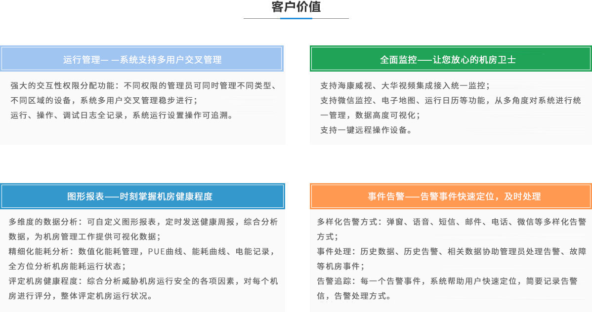 全面監控——讓您放心的機房衛士 多樣化告警方式:彈窗、語(yǔ)音、短信、郵件、電話(huà)、微信等多 樣化告警方式; 事件處理:歷史數據、歷史告警、相關(guān)數據協(xié)助管理員處理告 警、故障等機房事件; 告警追蹤:每一個(gè)告警事件,系統幫助用戶(hù)快速定位,簡(jiǎn)要記 錄告警信,告警處理方式。 |