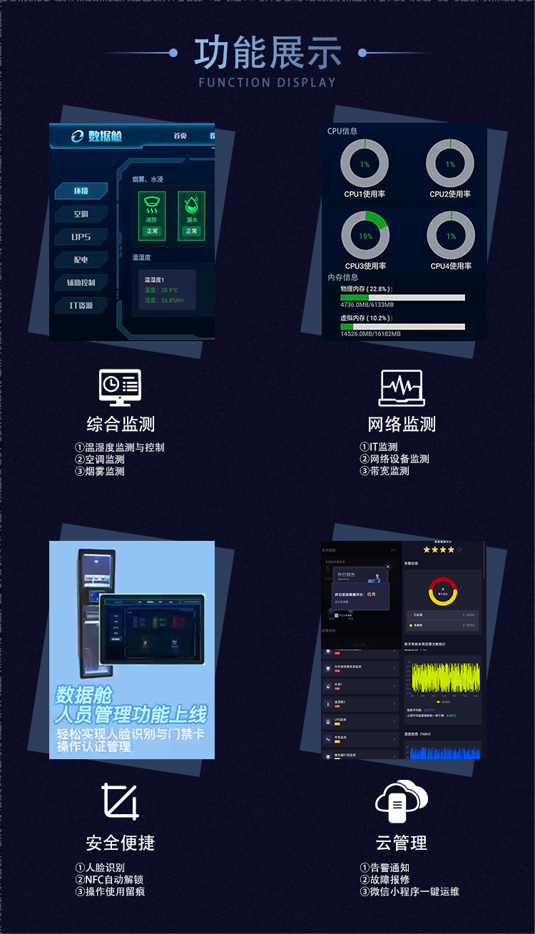 1.綜合監測:溫濕度監測與控制、空調監測、煙霧監測