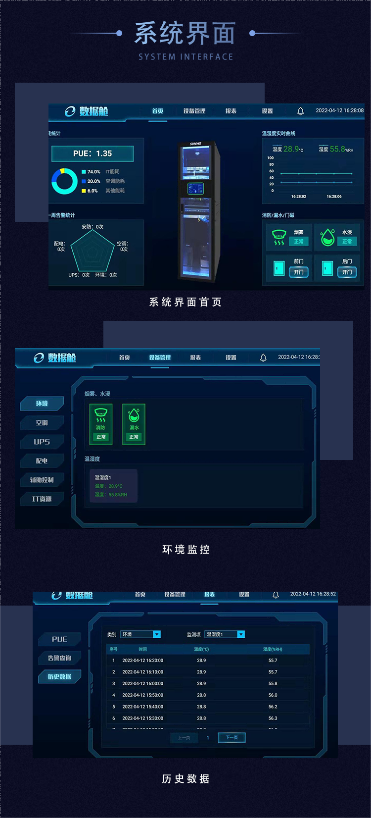 數據艙采用了嚴格的動(dòng)環(huán)監控系統,包括煙霧監控、溫濕度監控、空調監控、視頻監控(選配)等,24小時(shí)保護IT設備安全。